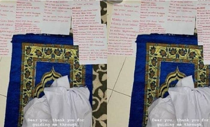 Melalui media sosialnya, Shima mengunggah foto sajadah berwarna biru dengan banyak kertas berjejer di atasnya.