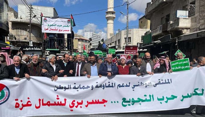 Di ibu kota, Amman, demonstrasi besar-besaran dimulai dari Masjid Al-Husseini di pusat kota hingga mencapai Al-Nakhil Square. Spanduk-spanduk dikibarkan dalam pawai itu dengan slogan-slogan seperti “Kami datang, hai Yerusalem” dan “Di mana orang-orang Arab? Dimana umat Islam?” dan “Hentikan perang kelaparan, dan bangun jembatan darat ke Gaza utara.”