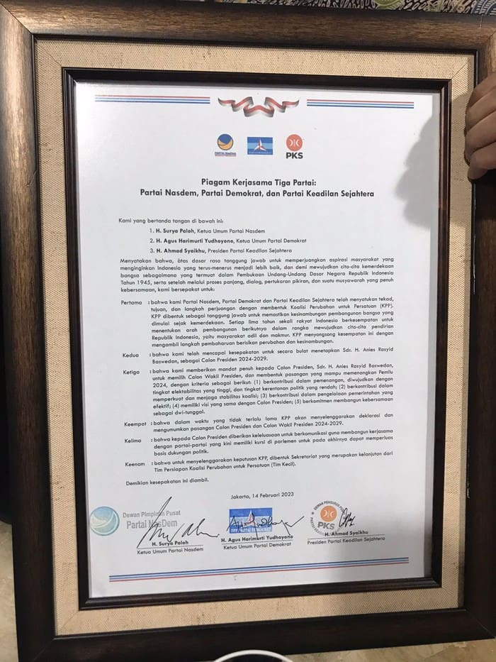 TIGA partai yang mencapreskan Anies Baswedan, Partai NasDem, Partai Demokrat, dan PKS, meneken piagam deklarasi Koalisi Perubahan untuk Persatuan atau KPP. Piagam itu memuat 6 poin kesepakatan.