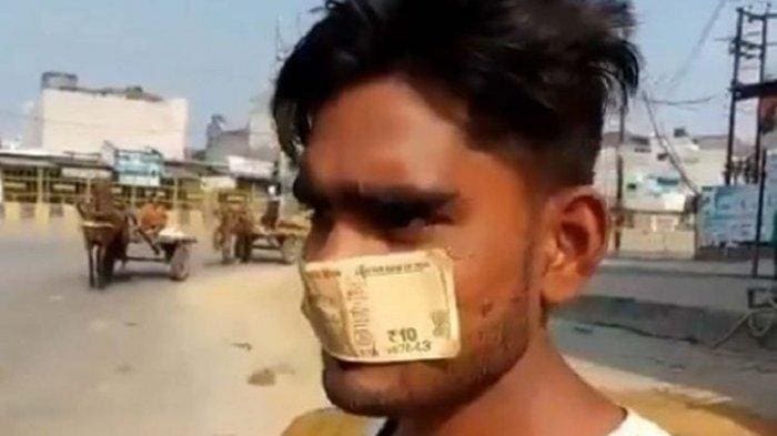 INDIA–Seorang pria di Meerut, India menempelkan uang kertas Rs 10 atau pecahan Rp2.000 di wajahnya sebagai pengganti masker. Hal itu ia lakukan lantaran tak mampu membeli masker.