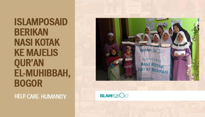 Sebanyak 35 box diberikan ke 35 anak yang sedang menjalankan program tahfidz Qur’an di Majelis Qur’an El Muhibbah, Bogor. Bertepatan di hari jum’at yang termasuk salah satu waktu mustajab untuk berdoa, IslamposAid menyertakan doa terbaik untuk para donatur agar disampaikan kepada anak-anak yang sedang mengikuti program tahfidz Qur’an.