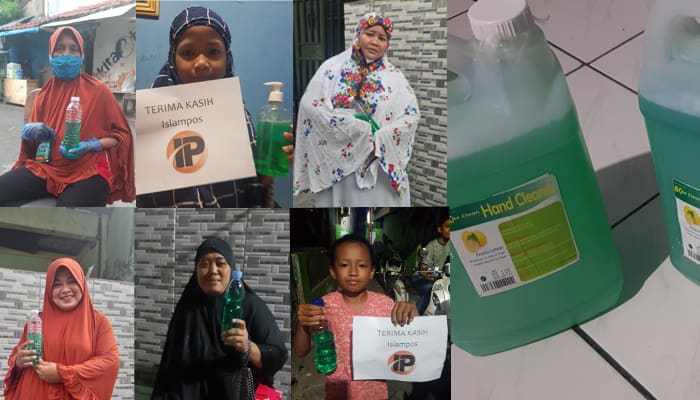Donasi sebesar Rp. 650.000 (Enam ratus lima puluh ribu rupiah) yang merupakan titipan dari para netizen Islampos dibelikan cairan pembersih tangan sebanyak 15 liter. Setelah itu, barulah cairan pembersih ini dimasukkan dalam botol bekas minuman mineral.