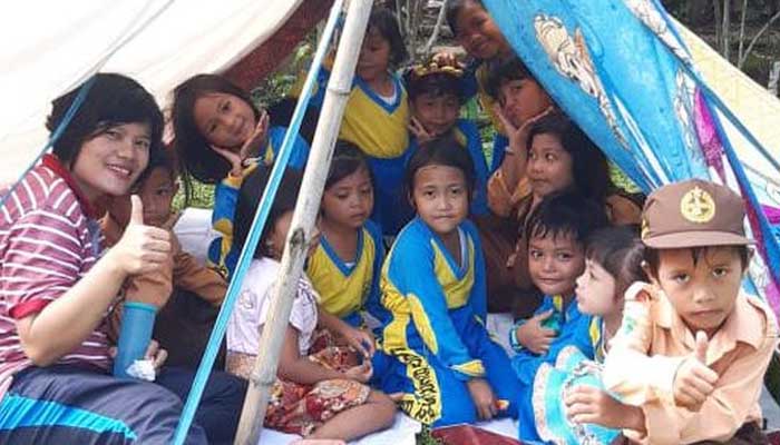 “Memang begini keadaannya, tapi kami tetap sekolah dengan riang gembira. Pandemi ini tidak menyurutkan semangat anak-anak,” katanya.
