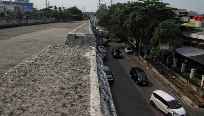 Menyusuri JLNT Pluit, sepanjang jalurnya terdapat banyak retakan dan batu kerikil berhamburan. Dalam jarak beberapa meter, nampak beberapa tumpukan batu yang dibiarkan begitu saja.