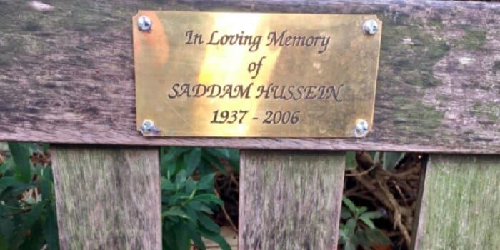 Plakat perunggu bagi Saddam Husein yang ditinggalkan di bangku di Wanstead High Street, berbunyi: “Dalam Kenangan Penuh Kasih dari Saddam Hussein 1937-2006.” Namun tidak jelas siapa yang meninggalkannya di sana.