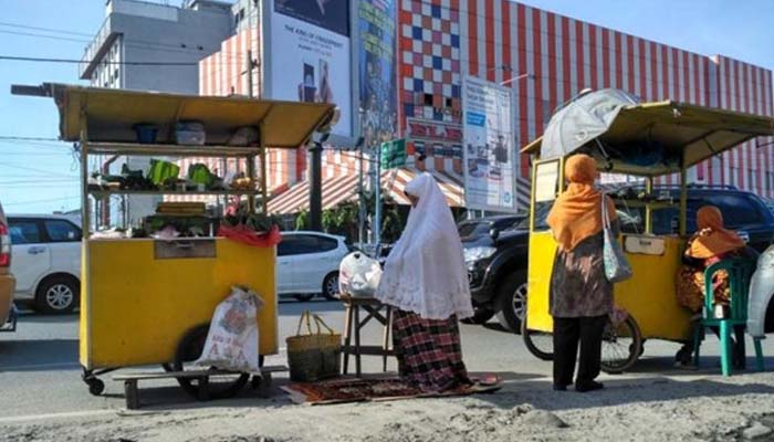 Air wudhu didapatnya dari toko kue atau dealer mobil yang tak jauh dari tempatnya berdagang. Jika hujan, dia shalat di teras ruko yang terhindar dari hujan.