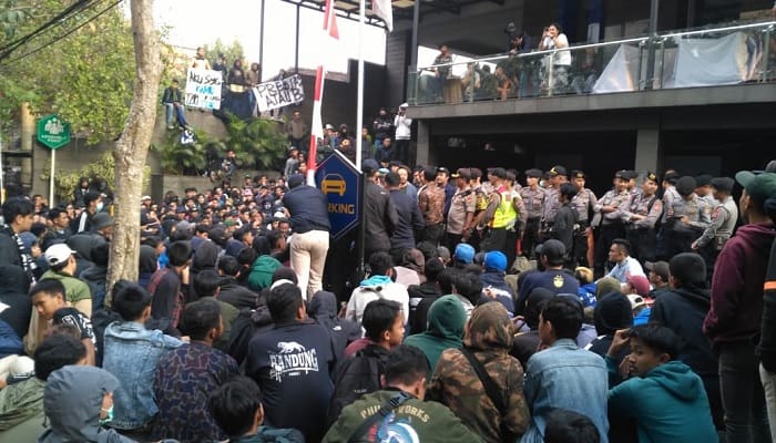 BANDUNG, — Ratusan suporetr Persib Bandung, Bobotoh melakukan aksi unjuk rassa di depan kantor manajemen persib bandung di Graha Persib jalan sulanjana Kota Bandung sabtu sore (10/8/19). Para Bobotoh Persib ini kecewa lantaran beberapa kali pertandingan Persib terus mengalami kekalahan padahal menurut mereka persib merupakan Club sepakbola besar di tanah air.