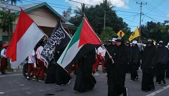 Selain membawa bendera tulisan tauhid, para siswa juga membawa bendera merah putih dan bendera negara Palestina. Mereka juga kompak menggenakan seragam berwarna hitam-hitam.
