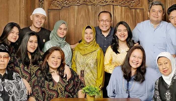 Di foto tersebut, Agung mengenakan busana koko lengan pendek berwarna cokelat dan celana panjang putih. Dia tersenyum ke arah kamera bersama keluarga besarnya, serta istri dan dua putrinya yang kompak mengenakan kaftan bermotif sama.