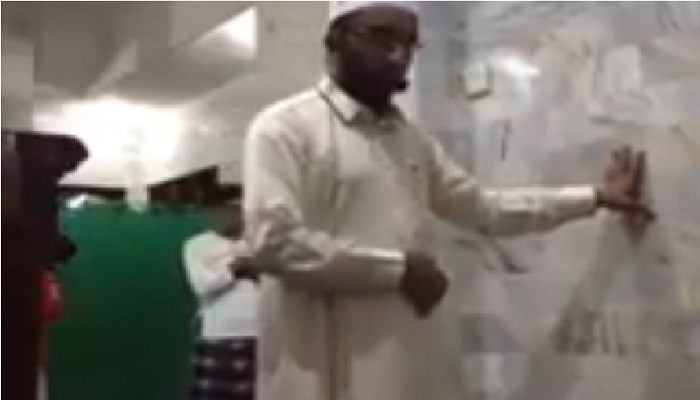 Imam tersebut berpegangan pada dinding masjid ketika gempa mengguncang. Beberapa jemaah lalu ada yang kembali menjalankan salat.